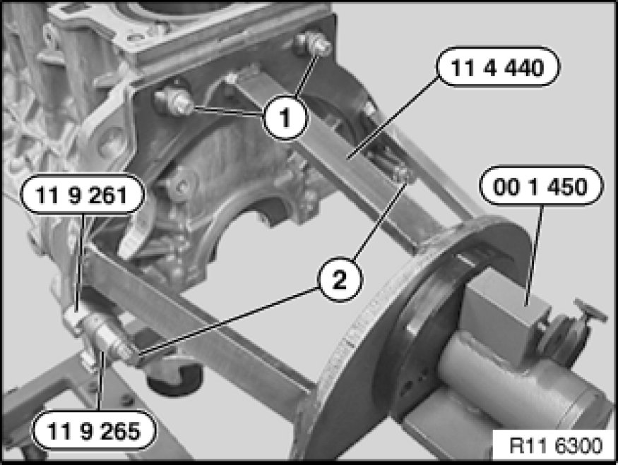 Bolt engine or engine block with steel bolts (1) and aluminium bolts (2) to special tool 11 4 440.