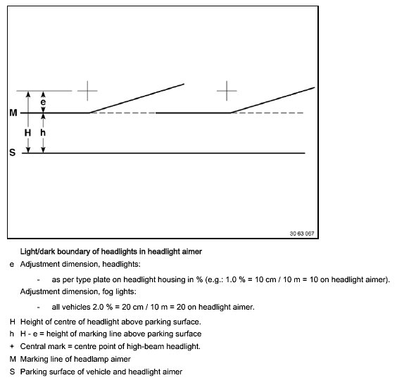 - Align headlight aimer with vehicle longitudinal axis and parallel to parking surface. Set marking line (M) on aimer to distance (e). Scale graduations on aimer are equal to a gradient in cm at a distance of 10 meters.