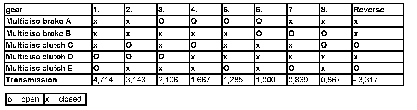 The following table shows the generation of individual gears. It shows which shift elements are closed and which are open as well as the resulting transmission.
