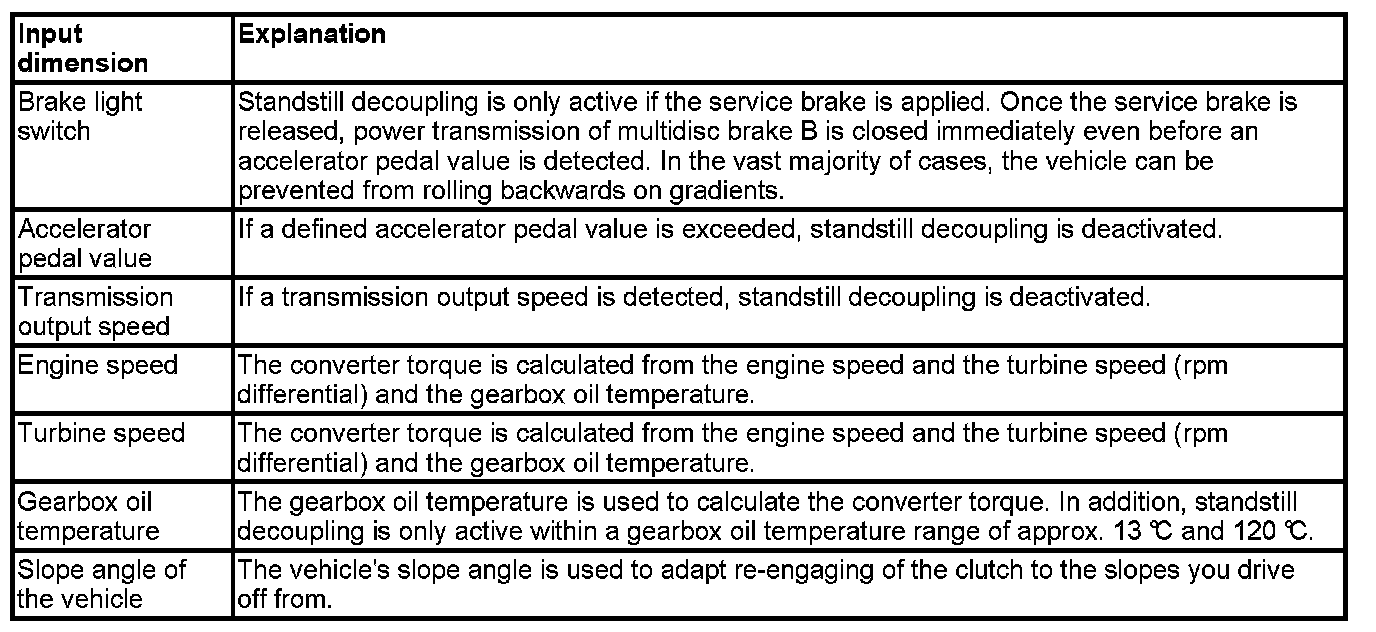 To enable driving off free of deceleration and load alteration, multidisc brake B is not completely opened. A slight slip of approximately 20 % remains so that some torque is transmitted to the torque converter. If multidisc brake B was completely open, no torque would need to be transmitted to the converter (except the inner friction in the gearbox). Jerking could result when driving off. The following example shows the difference in the gearbox between a vehicle with/without standstill decoupling. Values are approximate because inner friction was not taken into account.