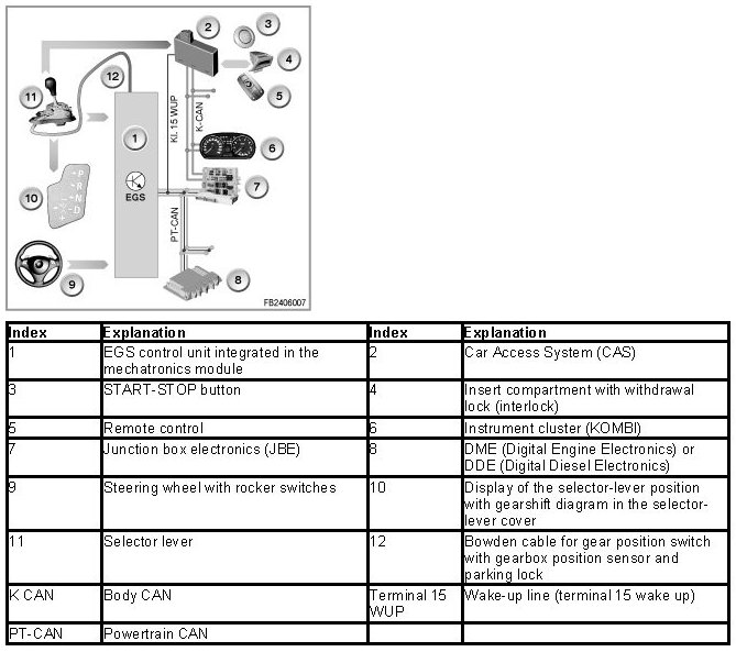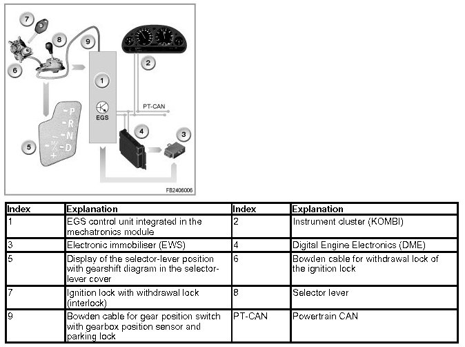 The data the EGS control unit requires to shift the gears is transferred on the Powertrain CAN (PT-CAN) to the EGS control unit (e.g. fuel injection period, engine speed, throttle-valve angle, engine temperature and engine intervention). In the mechatronics module, the EGS control unit directly activates the solenoid valves and the electronic pressure control valves.