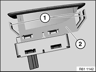 Retaining hooks (1) of rocker switch for side window operation (2) must not be damaged.