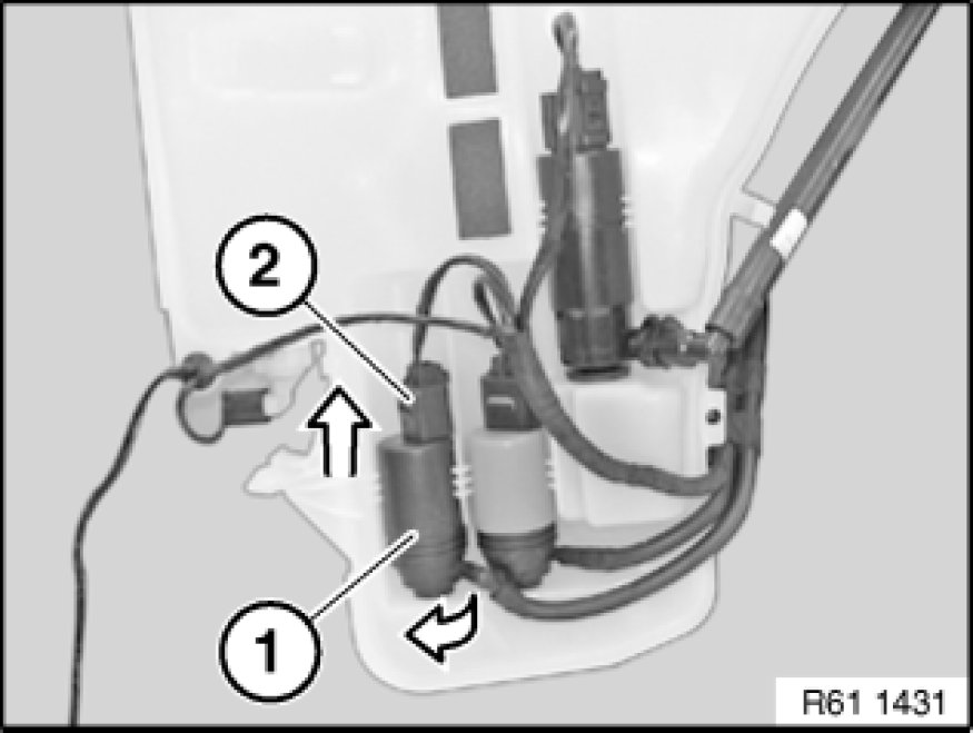 Turn washer pump for rear window washer system (1) if necessary and pull in direction of arrow out of fluid reservoir for windscreen washer system.