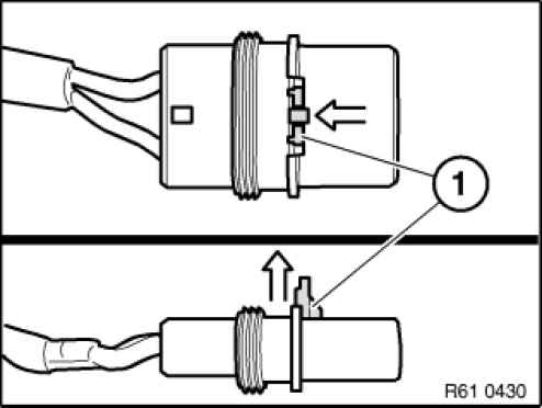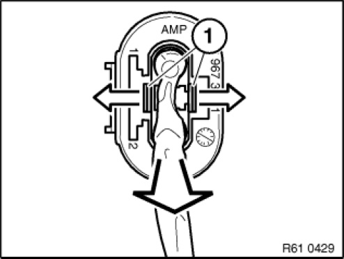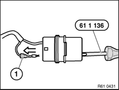 Unlock contact with special tool 61 1 136 and pull out cable (1) and contact towards rear.