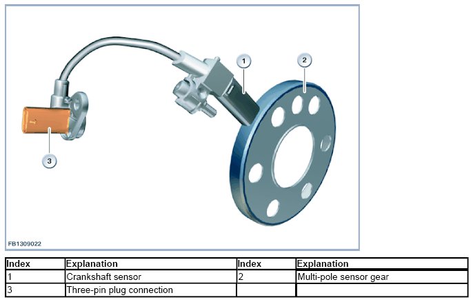 The crankshaft sensor is integrated in the radial sealing ring. The crankshaft sensor picks up the position of the crankshaft by means of a multi-pole sensor wheel bolted onto the flywheel. The Digital Engine Electronics (DME) uses this to calculate the engine speed. The camshaft sensor and the crankshaft sensor are needed for fully sequential fuel injection (fuel injection takes place individually optimized for each cylinder at the specific ignition point).
