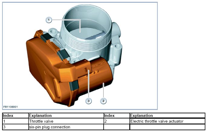 The electrical throttle valve actuator motor is attached to the intake air collector. The Digital Engine Electronics (DME) use this to calculate the position of the throttle valve: