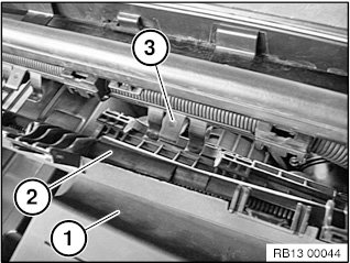 Push rear area of intake silencer housing (1) under B+ cable strip (2) and guide (3).
