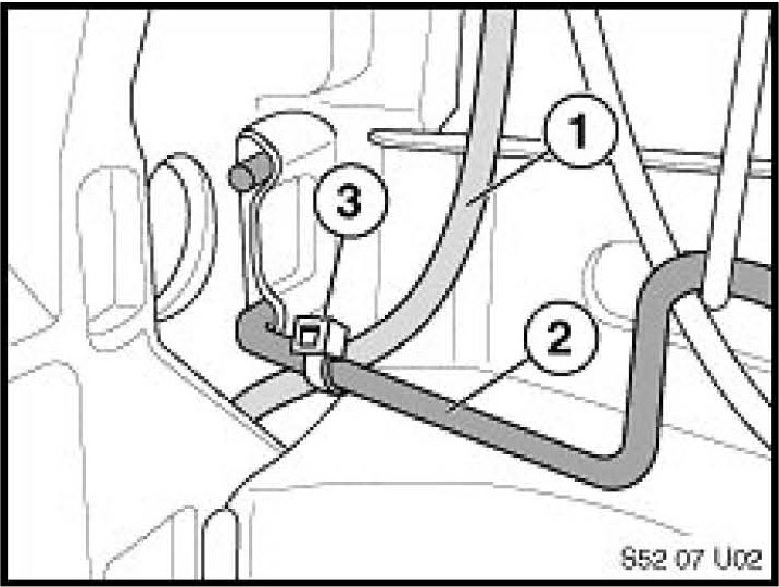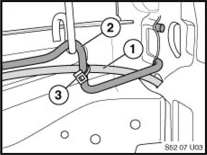 3. Secure the Bowden cable (1) on the outboard side of the seat to the seat frame (2) with a wire tie (3). The cable should be secured to the frame as far outboard as possible, as shown in the illustration.