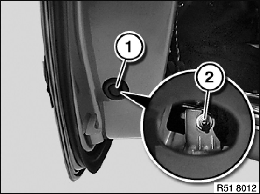 Lever out cover (1) and release nut (2).
