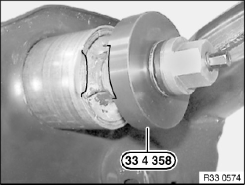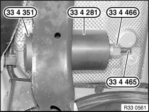 Pull on rubber rubber mount (1) with special tools 33 4 357 , 33 4 358 , 33 4 466 and 33 4 465 as far as it will go.