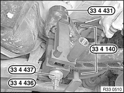 Using the special tools 33 4 436 , 33 4 437 , 33 4 140 and 33 4 431 , pull rubber mount out of bearing bush.