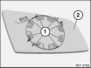 Fit mirror glass (2) with retaining lugs (1) flush on mirror adjusting drive and clip into place.