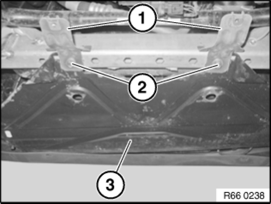 Release screws (2) and remove engine compartment shield brackets (1).