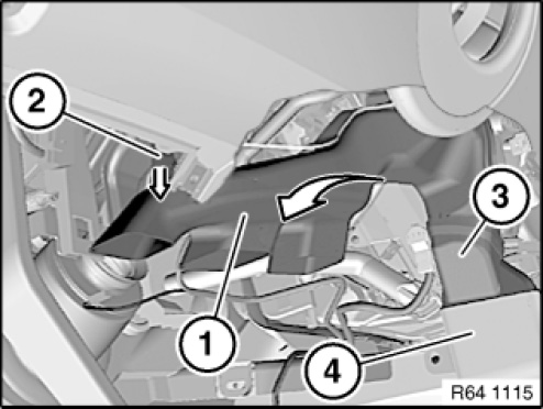 Detach left footwell heating duct (1) with adapter (3) from heating and air-conditioning unit and remove in direction of arrow from left rear compartment heating duct (4).