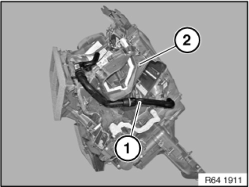 Effective 09/2009, vehicles with SA 606 (Navigation Business) or SA 609 (Navigation Professional) will no longer have vent hose (1) on heater (2). In addition, vehicles manufactured up to 09/2009 will no longer require vent hose (1) for parts replacement.