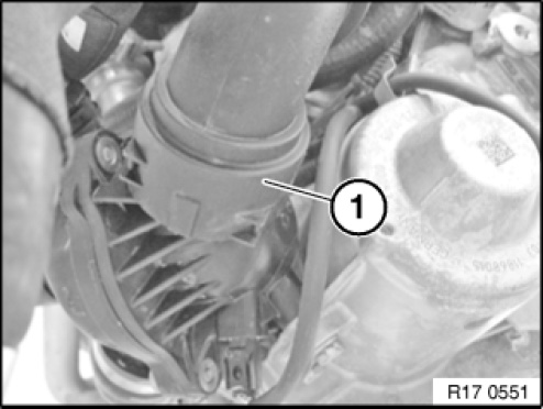 Unfasten and detach coolant hose (1) from thermostat housing.