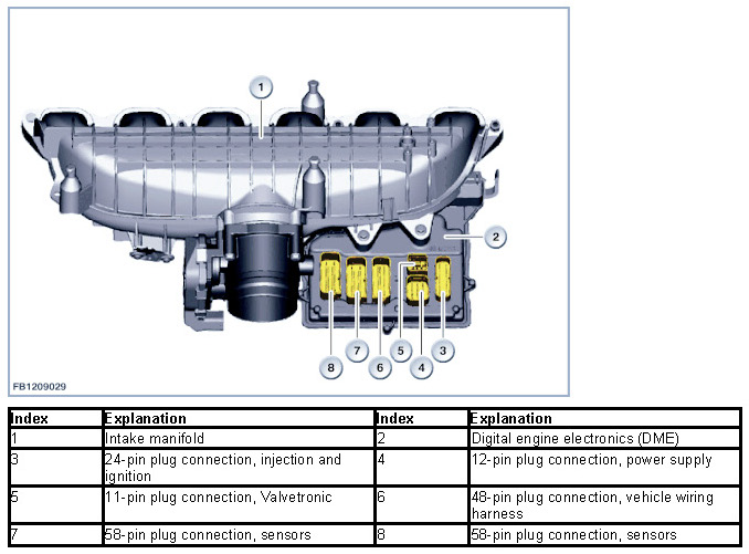 The DME digital engine electronics module furnishes the power to the sensors and actuators directly. The top side of the Digital Engine Electronics (DME) is simultaneously the lower section of the air intake system. There is a contour on the housing beside the intake pipe which assures optimum flow conditions into the intake system.