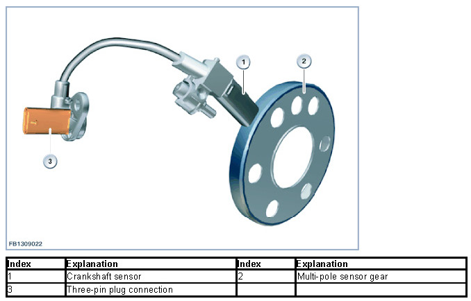 The signal from the crankshaft sensor means that the Digital Engine Electronics (DME) evaluate the crankshaft acceleration. The crankshaft acceleration provides an indication of the combustion quality of individual cylinders. The multi-pole sensor gear has 58 magnetic pole pairs as well as a reference point. The reference point on the multi-pole sensor wheel is shown by a magnetic pole pair that is twice as long.
