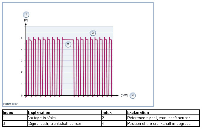 The transition from a high to a low phase is signalled by a change in the magnetic field. These changes are counted in the Digital Engine Electronics (DME). The difference between 2 changes of the magnetic field is 6° crank angle.