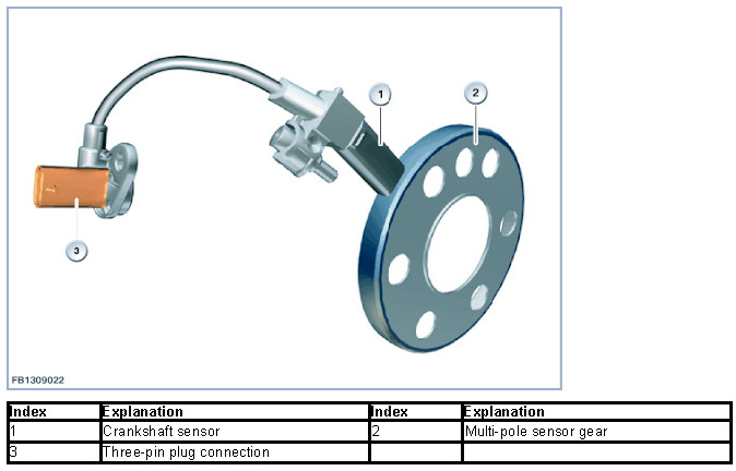 The signal from the crankshaft sensor means that the Digital Engine Electronics (DME) evaluate the crankshaft acceleration. The crankshaft acceleration provides an indication of the combustion quality of individual cylinders. The multi-pole sensor gear has 58 magnetic pole pairs as well as a reference point. The reference point on the multi-pole sensor wheel is shown by a magnetic pole pair that is twice as long.