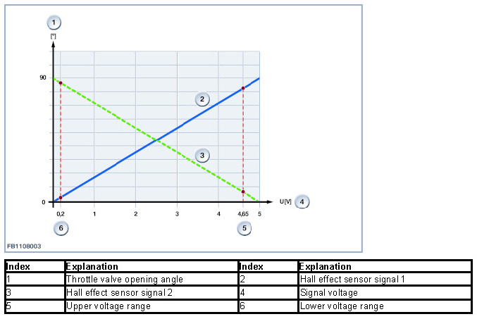 The Digital Motor Electronics (DME) receives a measured value of between 0 and 5 volts from the hall effect sensor. With the aid of the learned lower stop and a codable slope, the Digital Motor Electronics (DME) converts this voltage into the throttle valve opening angle. The diagnosis monitors the two signals with reference to a lower and upper voltage range.