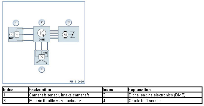The crankshaft sensor delivers a signal regarding the position of the crankshaft to the Digital Engine Electronics (DME). The Digital Engine Electronics (DME) use this signal to calculate the engine speed. With additional information from other control units (for example, power requirement of the auxiliary components), the Digital Engine Electronics (DME) regulate a stable idle speed.