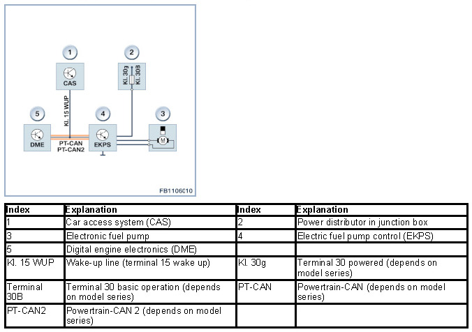 The electric fuel pump is an in-tank pump. The electric fuel pump is activated as soon as Terminal 15 is switched on.
