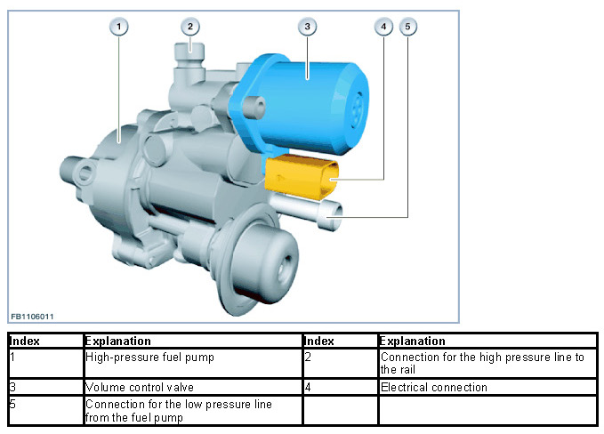 The high-pressure fuel pump boosts the fuel pressure (range from 50 to 200 bar) and maintains this fuel pressure to the rail. The high-pressure fuel pump is bolted onto the rear end of the vacuum pump. The driveshaft of the high-pressure fuel pump is connected to the driveshaft on the vacuum pump.