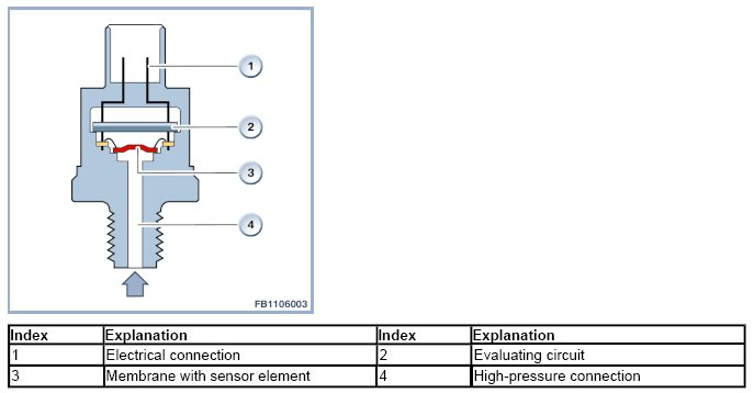 The fuel pressure reaches the diaphragm with sensor element through the high-pressure connection. The deformation of the membrane is converted via the sensor element into an electrical signal. The evaluating circuit processes the signal and forwards an analogue voltage signal to the DME. The voltage signal rises in linear form with increasing fuel delivery pressure.