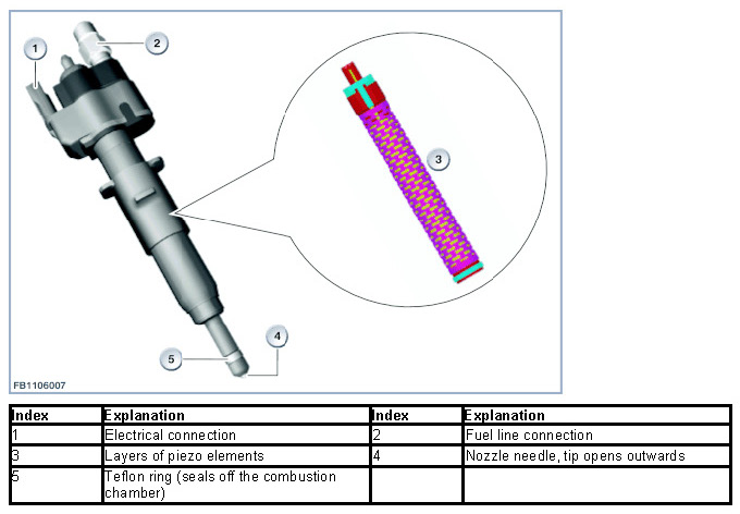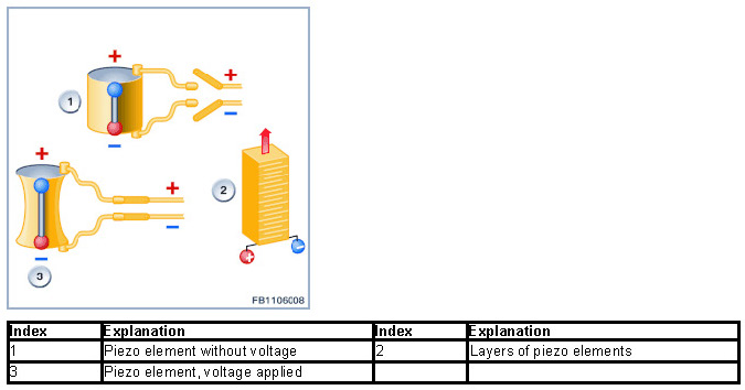 A piezo element is an electromechanical converter. The piezo element is a type of ceramic that converts electrical energy directly into mechanical energy (power/travel). The piezo element expands when voltage is applied. This creates the lift of the nozzle needle. To achieve a greater lift, a piezo element can be structured in a number of layers.