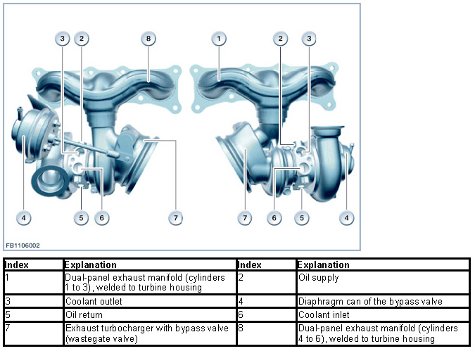 The engine is equipped with 2 exhaust turbochargers (one exhaust turbocharger at the exhaust manifold for cylinders 1 to 3, one exhaust turbocharger at the exhaust manifold for cylinders 4 to 6). The turbines permit especially high exhaust-gas temperatures (1050 °C technology), leading to a noticeable reduction in fuel consumption particularly at high load. The boost pressure of the exhaust turbocharger is controlled by the DME by means of a bypass valve (wastegate valve). A portion of the exhaust gases is fed via the bypass valve to the turbine. The bypass valves are controlled by the DME selector-pneumatic pressure converter and can be adjusted to various positions. 2 connection fittings for the engine's cooling circuit and 2 fittings for the lubrication circuit oil circuit are present to support cooling and lubrication in the exhaust-gas turbocharger.