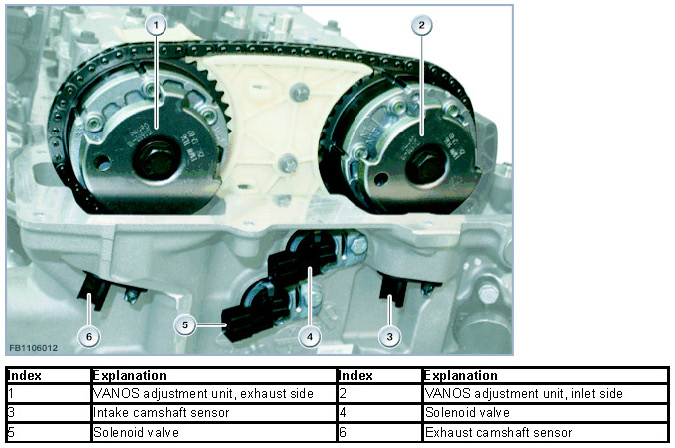 The variable camshaft timing control serves to enhance torque in the lower and middle engine speed range. A VANOS solenoid valve controls a VANOS unit on the intake side and the exhaust side. The VANOS solenoid valves are activated by the DME control unit. The timing of the engine can be influenced using the two variable VANOS adjustment units. A greater valve overlap results in lower amounts of residual gas at idle speed. A recirculation of internal exhaust gas in the partial load range reduces the volume of nitrogen oxide.