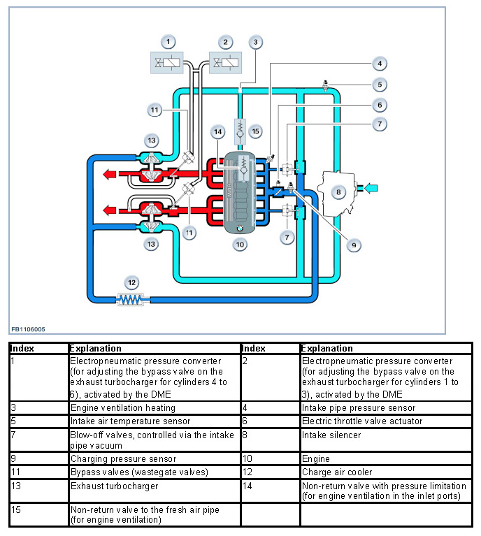 The boost pressure of the exhaust turbocharger is controlled by the DME by means of a bypass valve (wastegate valve). The bypass valves are activated via the electro-pneumatic pressure transducer by the DME (map controlled).