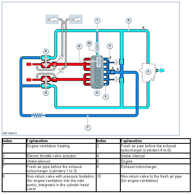 The engine ventilation is pressure-controlled. Depending upon the pressure levels in the intake manifold and the boost pressure, air is discharged either through a 6-channel distributor into the intake tracts or into the fresh-air intake duct on the intake side of the turbocharger (cylinders 4 through 6). The distributor rail is integrated in the cylinder head cover.