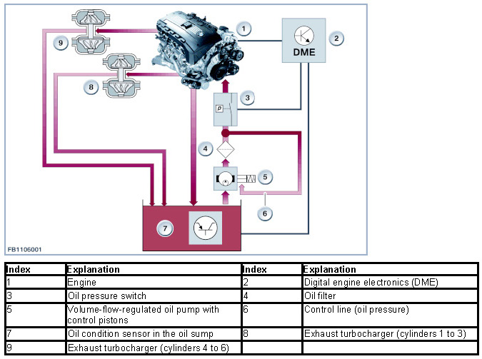 The oil condition sensor indicates the engine oil temperature and oil level to the DME control unit. To calculate the oil level, the DME control unit calculates the time it takes to heat up and cool down the engine oil. The oil pressure switch indicates the oil pressure. The DME control unit activates the warning and indicator lamp in the instrument cluster via the PT-CAN (red: oil pressure low; yellow: oil level low)
