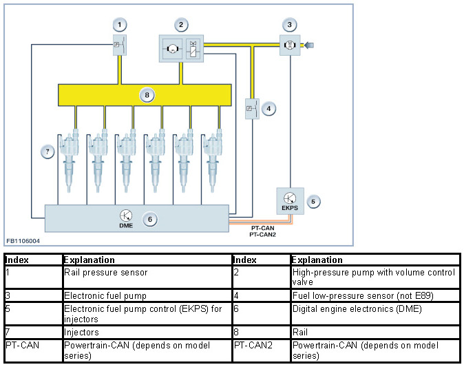 The DME control unit runs a continuous comparison between the specified pressure and actual pressure. If there is a deviation between the specified pressure and actual pressure, the DME control unit increases or decreases the voltage for the electric fuel pump, sent as a message across the PT-CAN to the EKP control unit. The EKP control unit converts the message into an output voltage for the electric fuel pump. These regulates the required delivery pressure for the engine (or high-pressure pump).