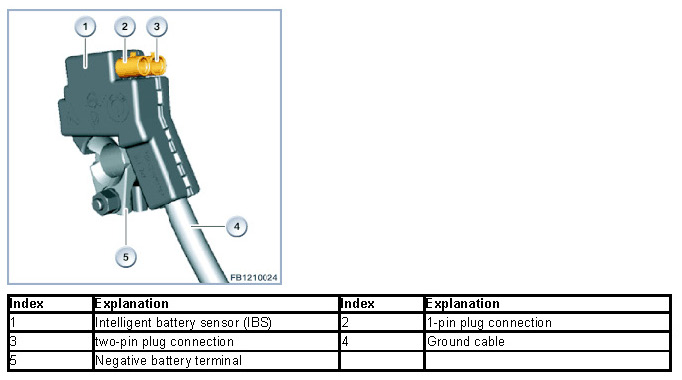 The intelligent battery sensor (IBS) evaluates the current quality of the battery. The intelligent battery sensor (IBS) is a component of the negative battery terminal. The intelligent battery sensor (IBS) regularly (cyclically) measures the following values: