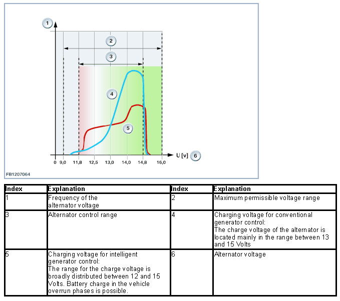Unlike the normal charge voltage control, the intelligent alternator control prevents complete charging of the battery. The battery charge goes up to the range between 70 to 80 % of the maximum possible charge. Intelligent generator control is suppressed cyclically. This temporarily permits 100% battery charging to achieve full battery capacity over the long term (regeneration). With intelligent alternator control, the alternator voltage is located more frequently in the low voltage range in order to have free battery capacity for energy recuperation.