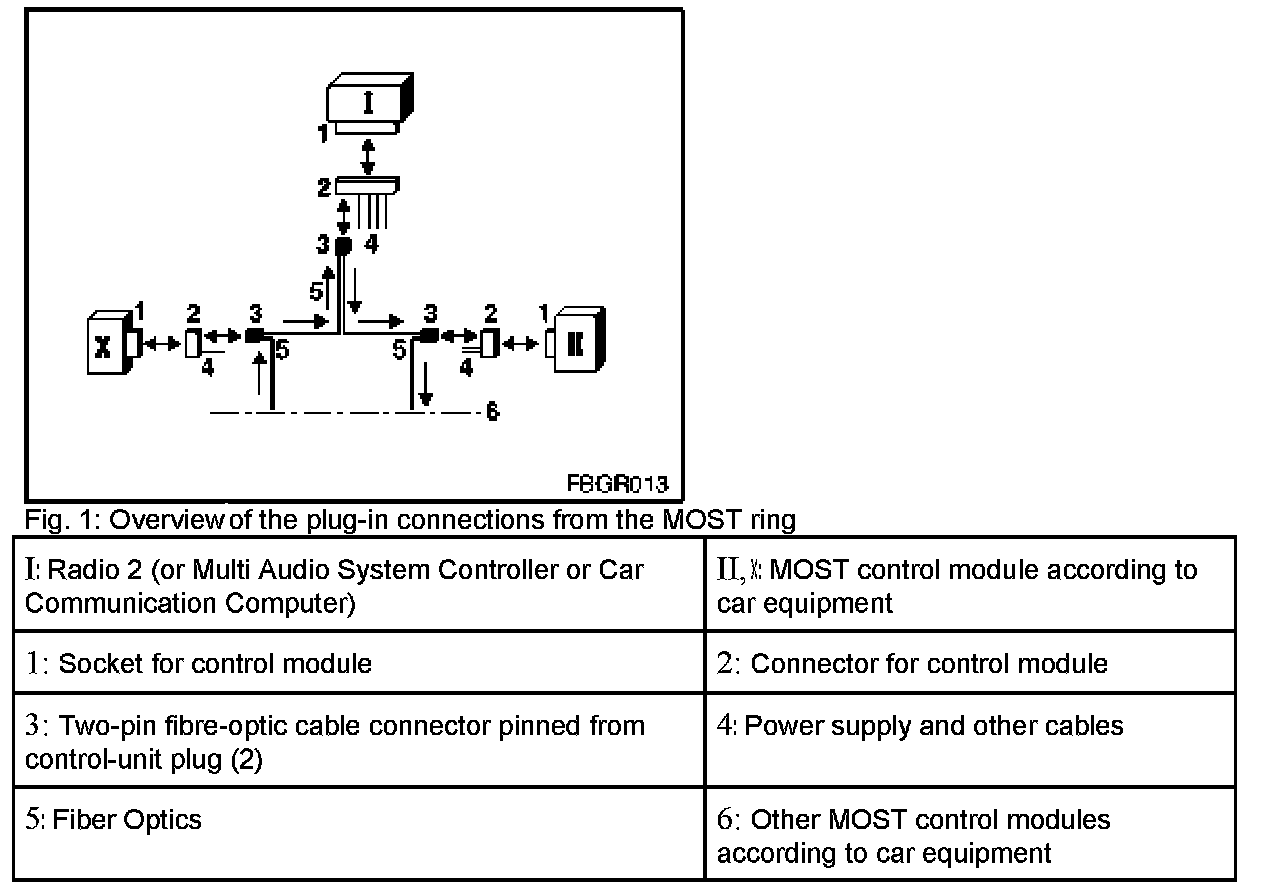 The MOST (Media Oriented Systems Transport) network uses a ring bus for data communication between the various control modules. Signal transmission is by means of fiber-optic cable. Data transmission on the ring bus takes place in one direction only. On the MOST ring, messages can only be transmitted provided the bus ring is complete and fully functional. If there is a ring fault in the MOST network, the system can only communicate with the Radio 2 (or Multi Audio System Controller or Car Communication Computer). This is possible because the control module is directly connected to the K-CAN data bus. There is a transmission and a reception module (transmitter and receiver) as a unit in each MOST control module for connecting to the MOST bus. The unit has an integrated transmit and receive diode. The optical testing and programming system can be used to test the transmitter and receiver of a control module.