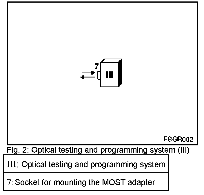 For the optical test of a control module (or fibre-optic cable), the control module (or fibre-optic cable) must be connected to the optical testing and programming system using an adapter. However, each adapter has a different attenuation value. So that these different attenuation values are taken into account in the optical test, calibration must be carried out before each optical test. During the calibration, there is also a check as to whether the adapter is OK. The various calibrations, depending on whether a MOST control module or a fiber-optic cable is being tested, are shown below.