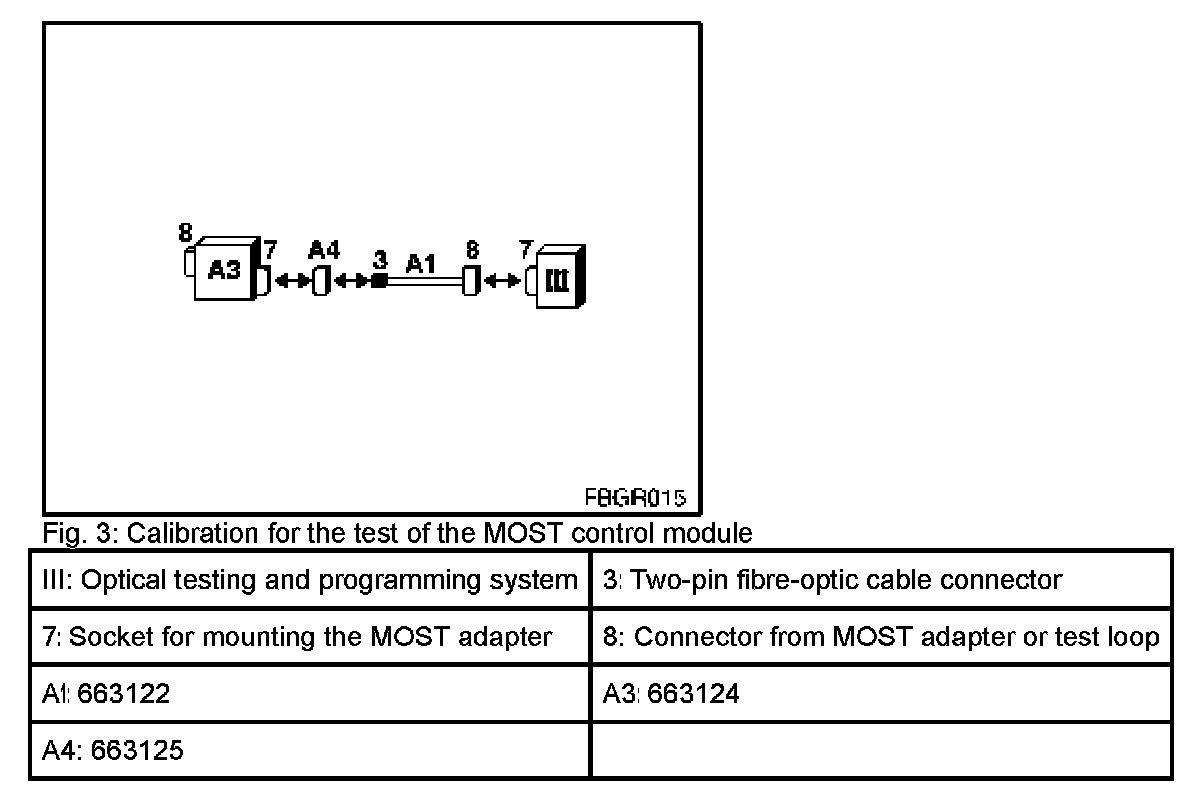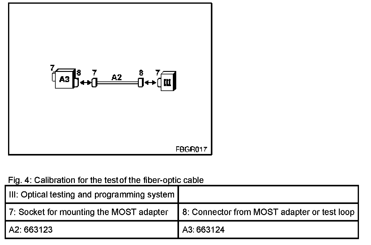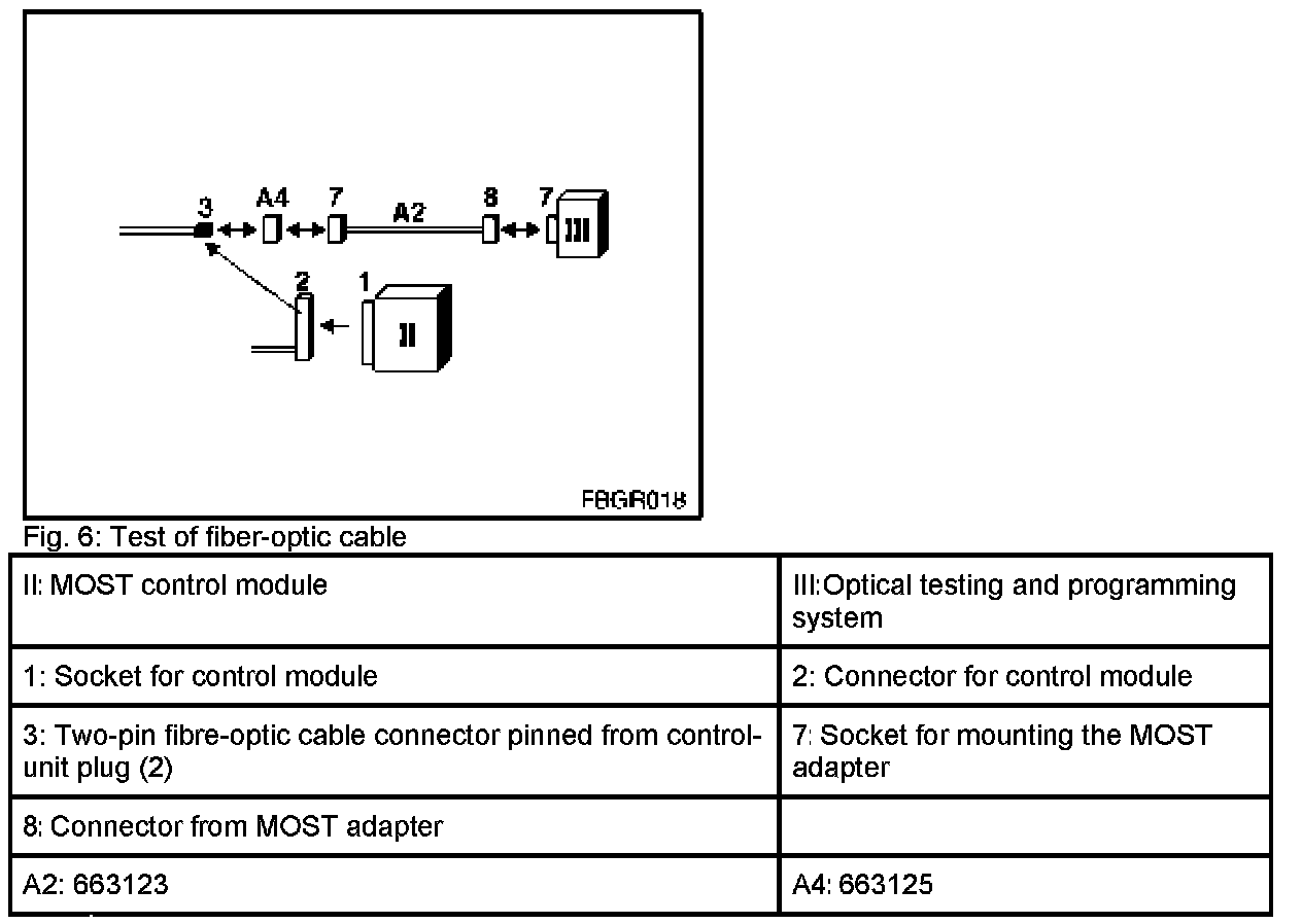 Test of fibre-optic cable: To test the fibre-optic cable, the MOST wiring harness extension (A2 = 663123) and plug housing are required (A4 = 663125). Procedure for testing the fiber-optic cable: