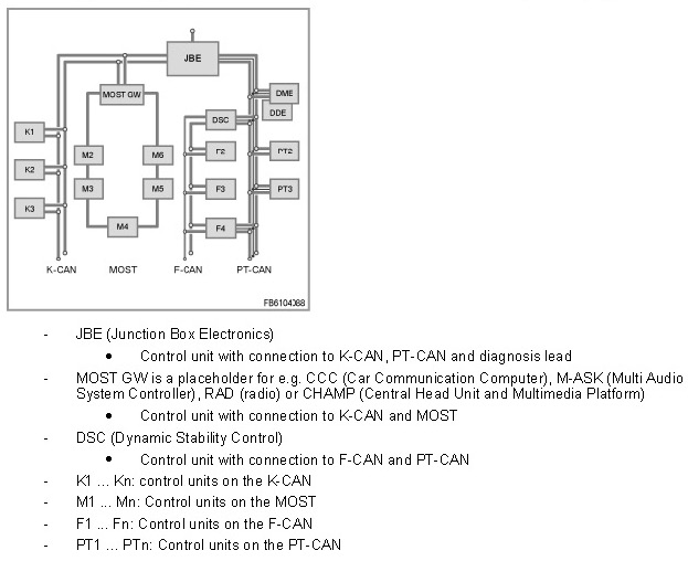 The following block diagram provides an overview of the control units and bus systems deployed in the vehicle.