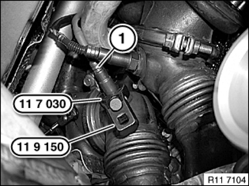 Release oxygen control sensor (1) with special tools 11 7 030 and 11 9 150.