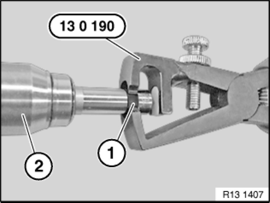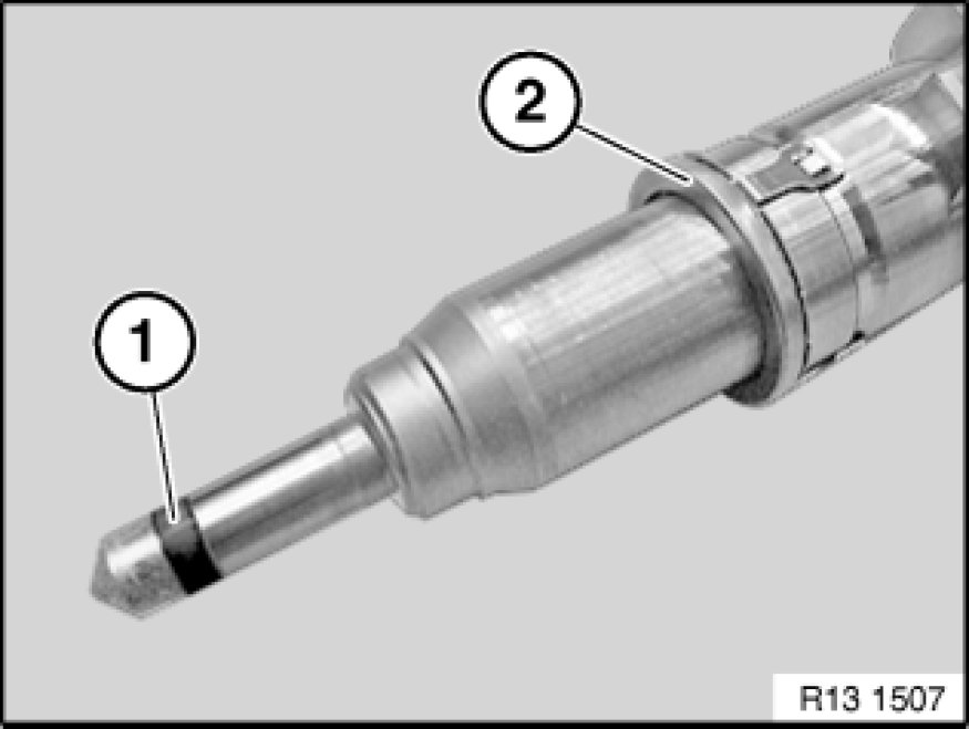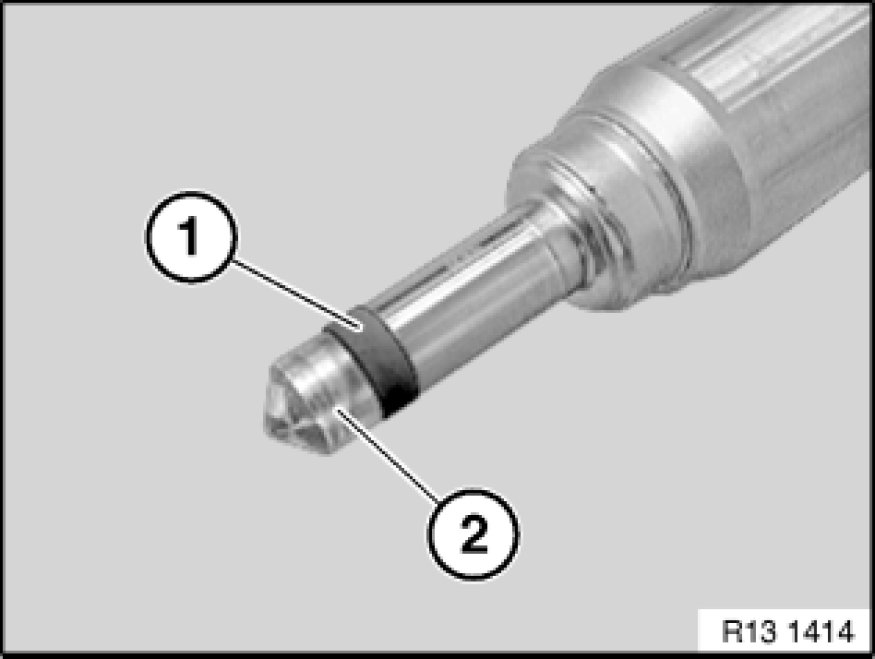 Remove PTFE sealing ring (1) with special tool 13 0 191 from injector (2).