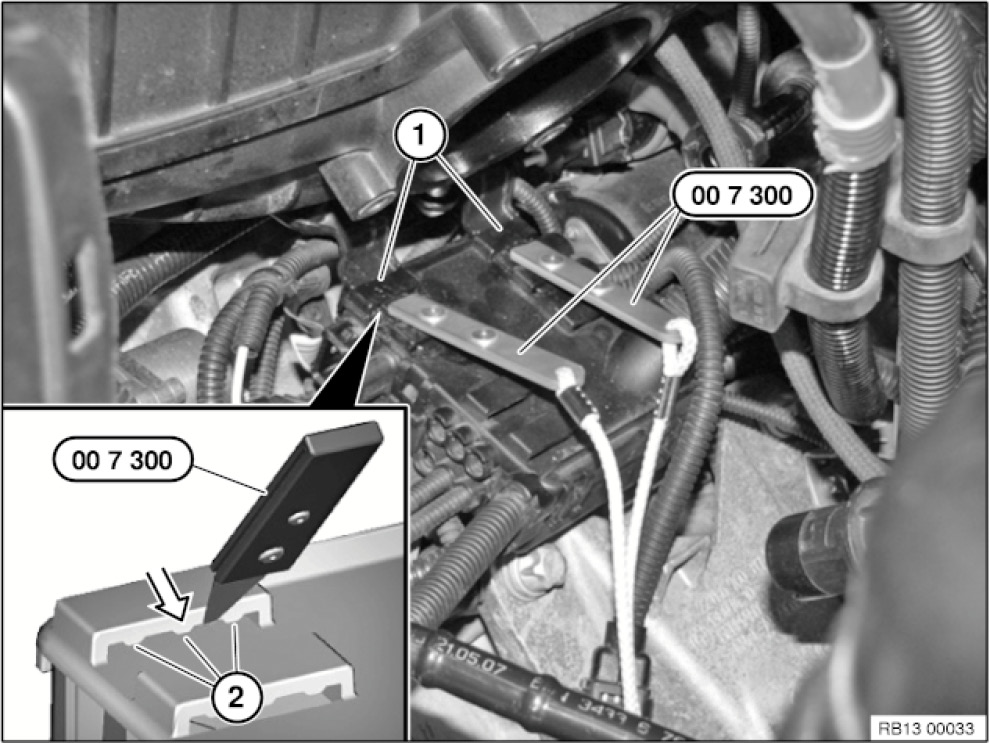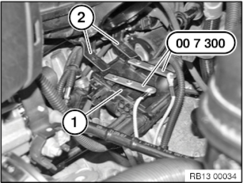 Place tips of special tool 00 7 300 between retainers (2) and then centre (arrow).