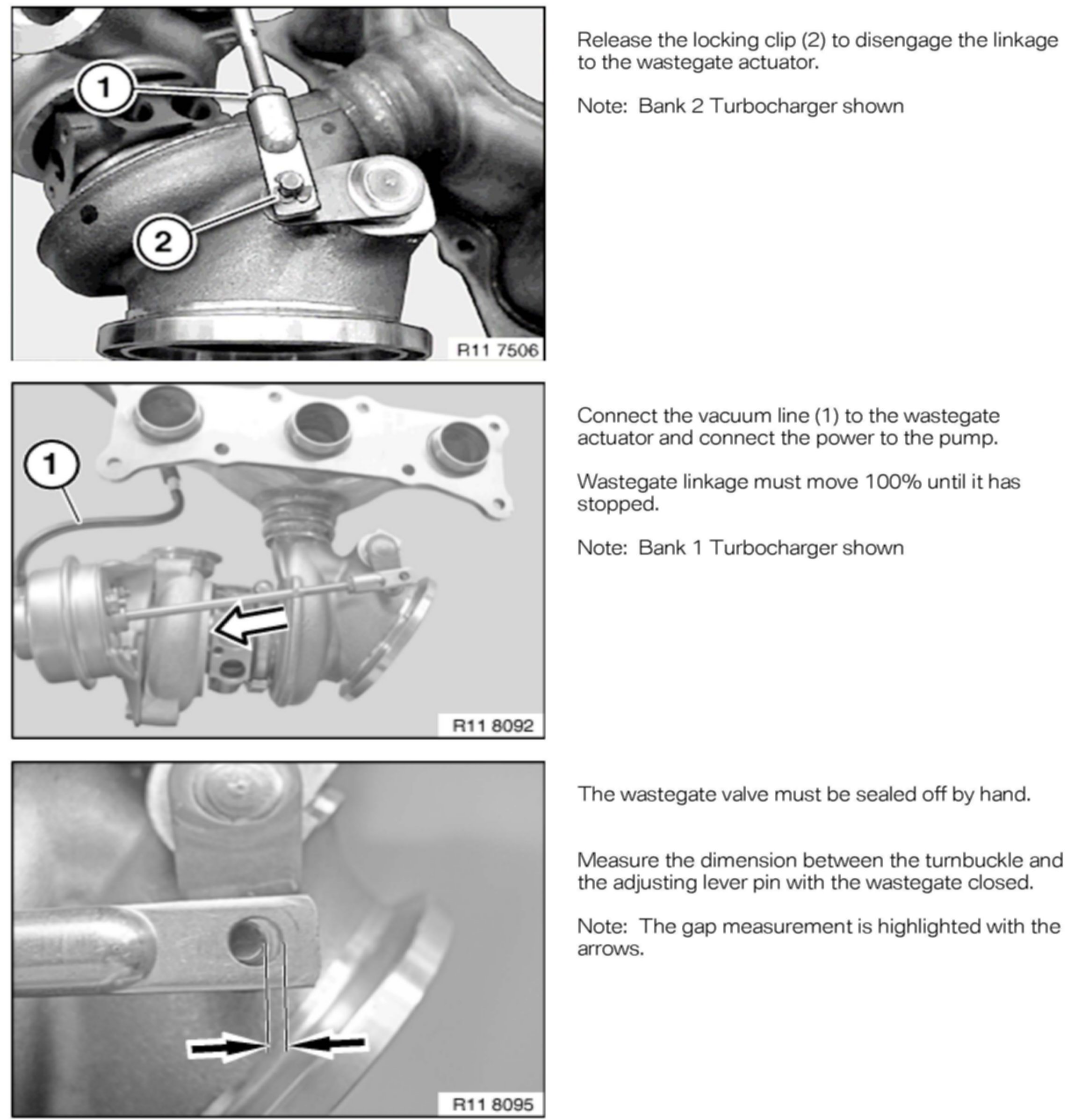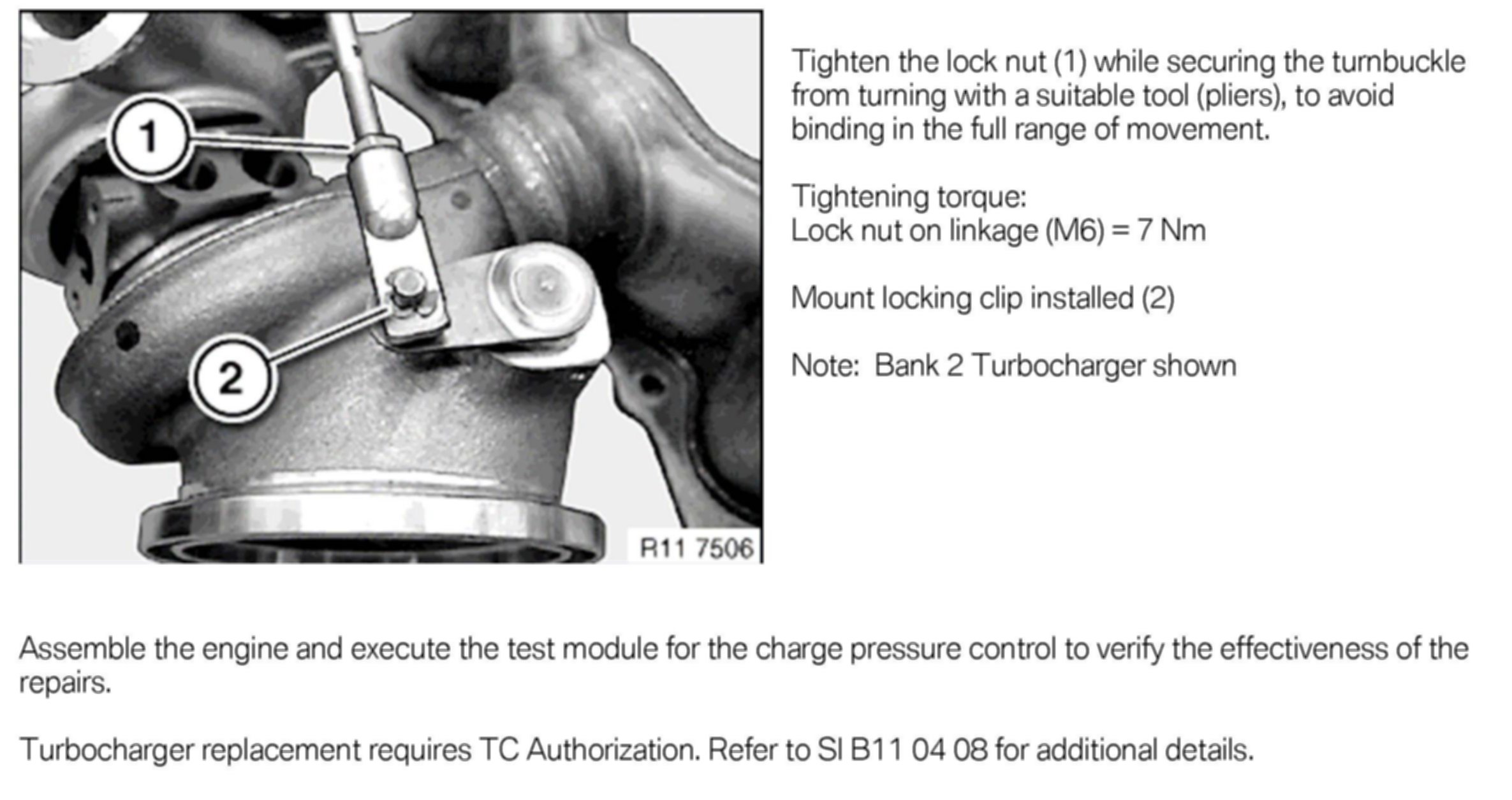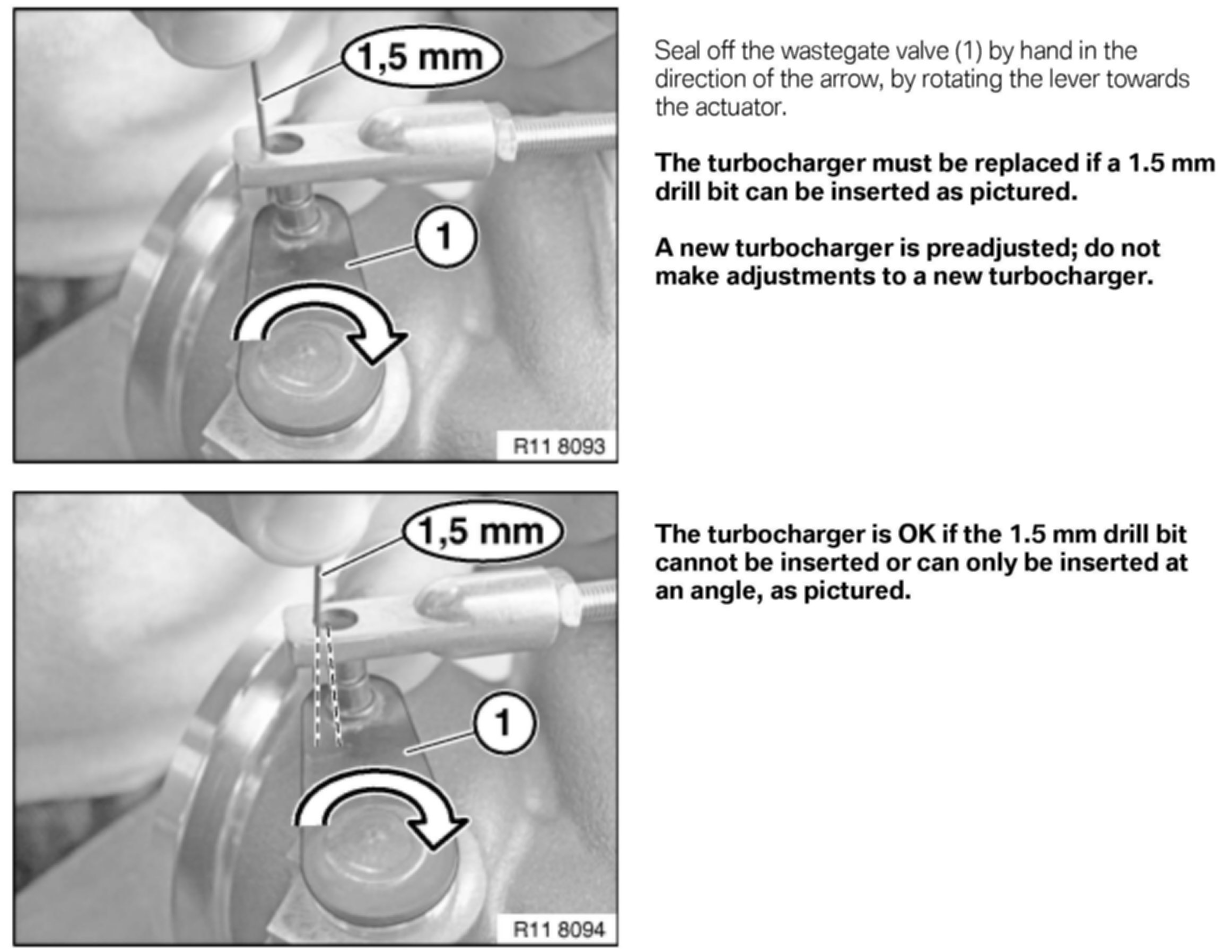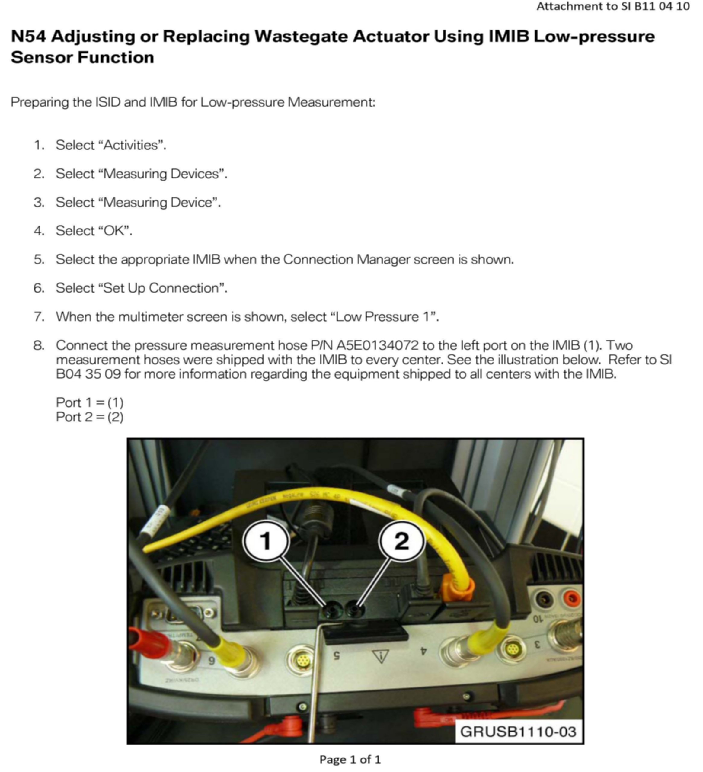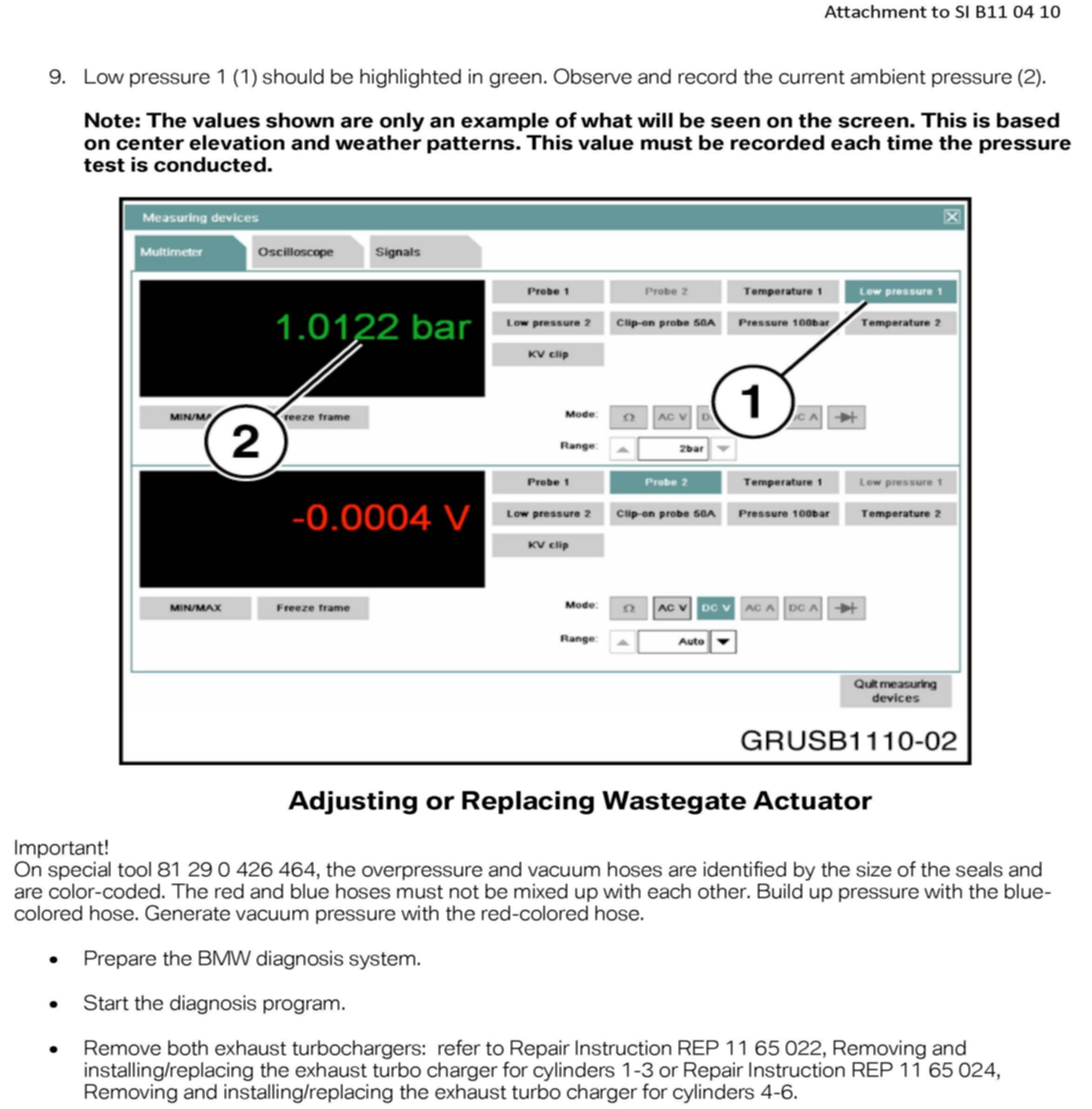 The current version of Repair Instruction REP 11 65 580, Replacing the wastegate vacuum unit (N54 and N54T), describes using the 100-bar pressure transducer with GT1 or DIS Plus (2G) equipment. Attached is a repair instruction supplement describing procedures for adjusting and replacing the wastegate actuator, using the ISID, IMIB and the low-pressure measurement features.