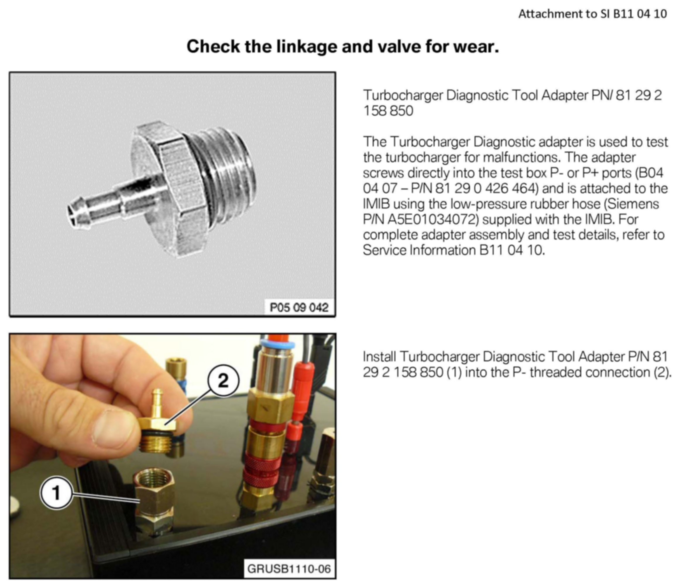 Turbocharger Diagnostic Tool Adapter P/N 81 29 2 158 850 will be required to operate the IMIB with the Turbocharger Diagnostic Tool P/N 81 29 0 426 464. Refer to SI B04 15 10 for more details regarding Automatic Tool Shipment.