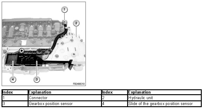 The gearbox position sensor is a no-contact Hall sensor. The gearbox position sensor is attached to the hydraulic control unit (hydraulic selector unit).