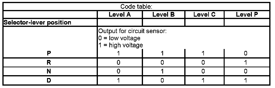 The 5 inputs of the gearbox position sensor show each selector-lever position. The selector-lever position is transferred to the gearbox position sensor across a Bowden cable and is converted by the gearbox position sensor into a code. This code is transferred to the gearbox control and engine management system.