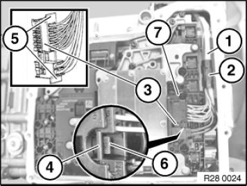 Release connector lock (6) and at same time detach connector (3) from retaining tabs (5) towards right.